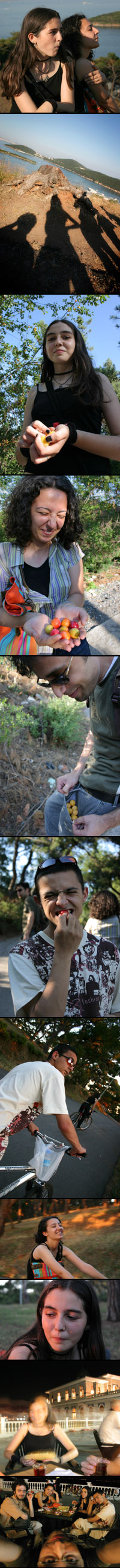 Onur's sister Ilke was in Istanbul to join in an art exhibition. So we decided to take a short trip to Princess Islands. :) You see us eating some fruits we stoled from the private lands in Burgaz, then bicycle ride in Buyukada, 'till the night.